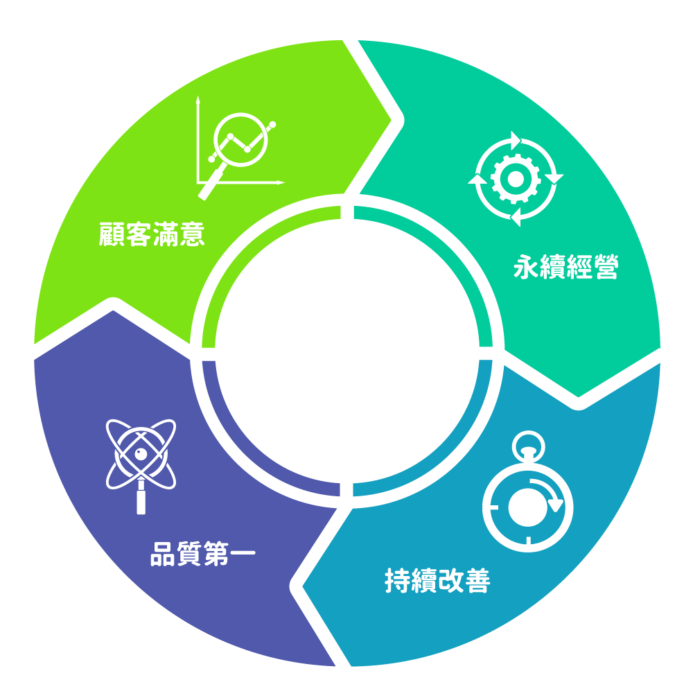 不斷的持續改善,確保品質不斷提升,而顧客滿意、員工滿意及公司獲利的基礎上達成公司的企業使命,提昇客戶對產品之信賴度及實現公司經營理念。